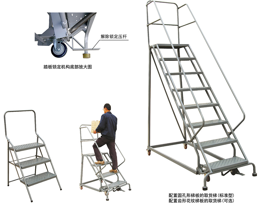 ● 優(yōu)客力配置踏板鎖定機(jī)構(gòu),踩壓底部踏板可自動固定梯子,踩壓底部踏板下方的解除鎖定壓桿,便可輕松移動取貨梯。